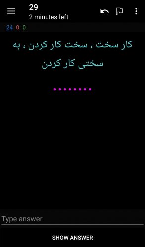 2. پکیج Persian to English & Type فقط فارسی به انگلیسی هست. در این پکیج هم پس از باز شدن فلش کارت و نمایش فارسیِ واژه، شما ابتدا واژه انگلیسیِ جواب رو تایپ میکنید و املاتون تصحیح میشه و بعد لغت انگلیسی نمایان میشه.
