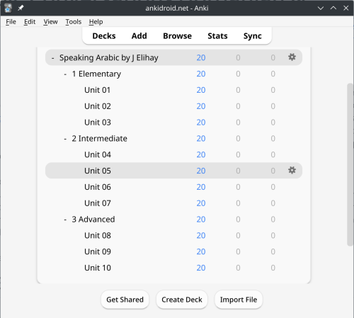 علاوه بر کتاب، من این دسته فلش کارتی را که برای تکمیل مطالعه ام در مورد "گفتار عربی" ایجاد کردم، توصیه می کنم. این دسته که شامل بیش از 4500 عبارت و جمله به گویش محاوره ای فلسطینی/اردنی است. برای من مهم بود که جملات را به خط عربی داشته باشم، زیرا کتاب عمدتاً از عربی رونویسی/رومانی شده استفاده می کند. بنابراین، من بیش از دو سال وقت صرف کردم تا متن ترجمه شده را به خط عربی تبدیل کنم تا تجربه یادگیری خود را تقویت کنم و توانایی خود را در خواندن و نوشتن عربی محاوره ای بهبود بخشم. اکنون با اطمینان می توانم تسلط خود را در صحبت کردن به عربی به استفاده روزانه از این دسته Anki نسبت دهم.