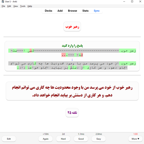 این فایل شامل 103 کارت آموزشی می باشد که به دو دسته تقسیم می شود: خلاصه کتاب و دستورالعمل ها . در هر کارت با این که جواب آماده است اما با امکان تایپ در زیر آن می توانید متن را به ملکه ذهنتان تبدیل کنید . در واقع وقتی این جملات را چندین بار بخوانید از حافظه کوتاه مدت به حافظه بلند مدت و سپس دو به بال و بازو برای شما تبدیل می شود : بال و بازوی ذهنیت مثبت و قوی و محرک – و بال و بازوی اقدامات کوچک و موثر برای اهدافتان