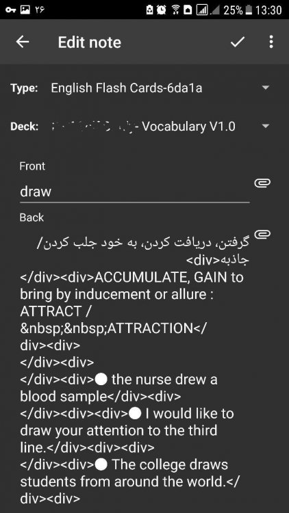 درود بر شما نیز 1- یعنی دک مورد نظر رو اکسپورت کنم درسته؟ انجام دادم 2- اینم رفتم 3- انجام دادم، یکی دو تا از کارتها انتخاب شدند 4- اینو زدم اما تمام کارتهای توی دک را انتخاب کرد، از هر نوع نوت و چیزی که بودند 5- منوی Edit => Change Note Type درسته؟ اینم رفتم 6- چون توی مرحله 4 تمام کارتها رو انتخاب کرده بود ارور داد که: Please select cards from only one note type 7- -