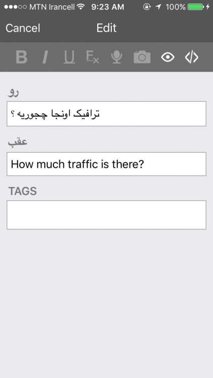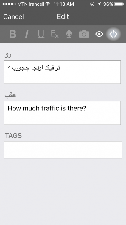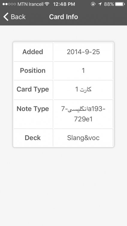 با سلام از زحمات و پیگیری شما تشکر میکنم انشاالله موفق باشد من و دوستانی که از آی او اس استفاده میکنیم بی صبرانه منتظر آموزش های شما هستیم .من به صورت کامل از برنامه راضی هستم و از کار با اون لذت می برم و به دیگران پیشنهاد میکنم و از نظر من از دیگر اپ های اپ استور جذاب تر هست فقط اگر امکان تعدیل قیمت اپ در پلتفرم آی او اس تا حدود 2 یا 3 دلار وجود داشته باشد ( با توجه به خرید آسان اپ های اپ استور از طریق اپ ویترین سیبچه با کارت بانکی ایران ) و همچنین اضافه کردن زبان پارسی به اپ باشد، مطمئنا شاهد استقبال خیلی بیشتر از این اپ در ایران و خارج از ایران خواهید بود. با آرزوی موفقیت برای شما من یه اسکریت شات ار Card Info برای شما میفرستم من کدی رو مشاهده نکردم . من فایل روهم میفرست اگر امکان دارد زحمت جابجایی این فایل رو بصورت اینکه کارت انگلیسی اول نشون داده شود رو بکشید.ممنونم Slang&voc.apkg -