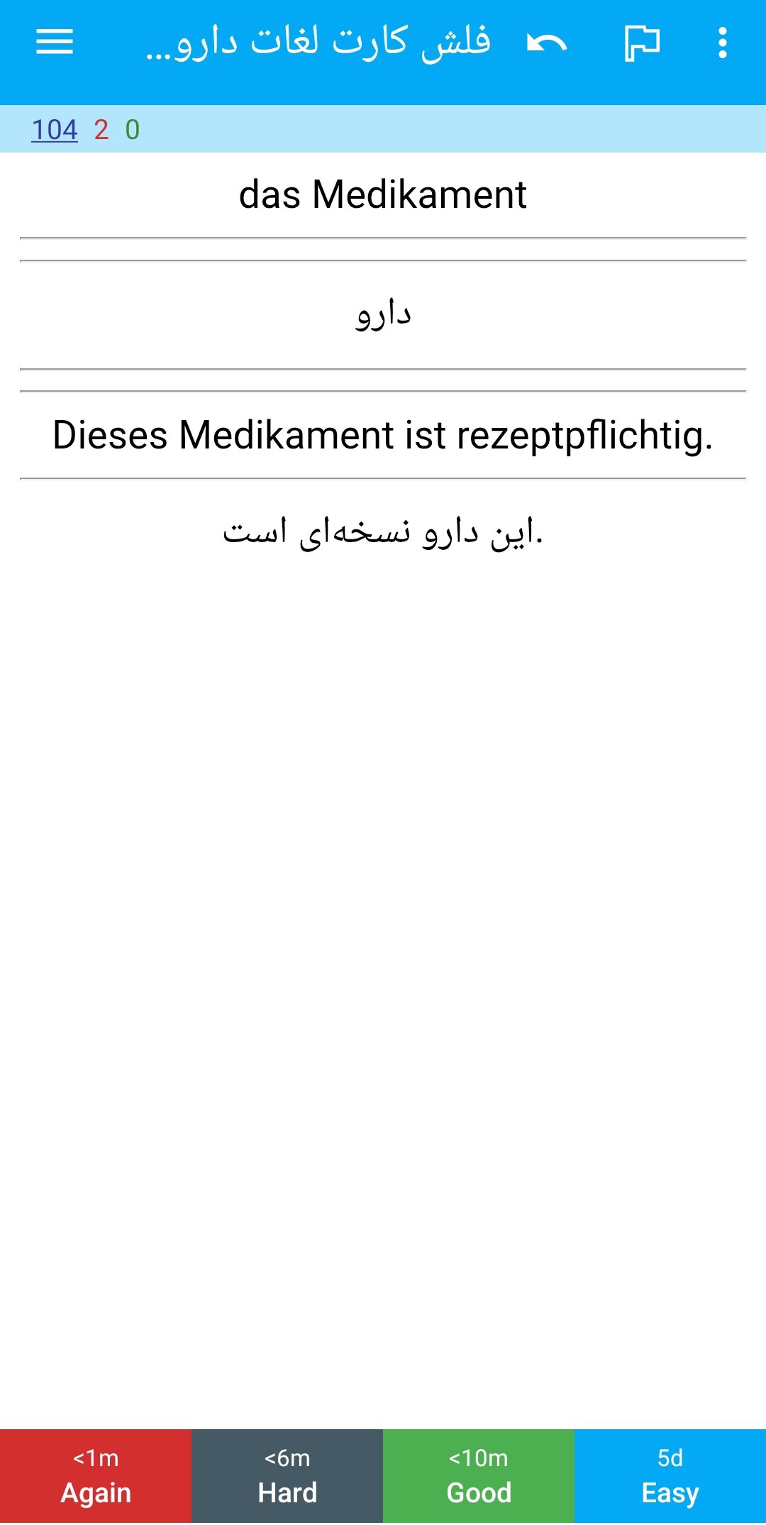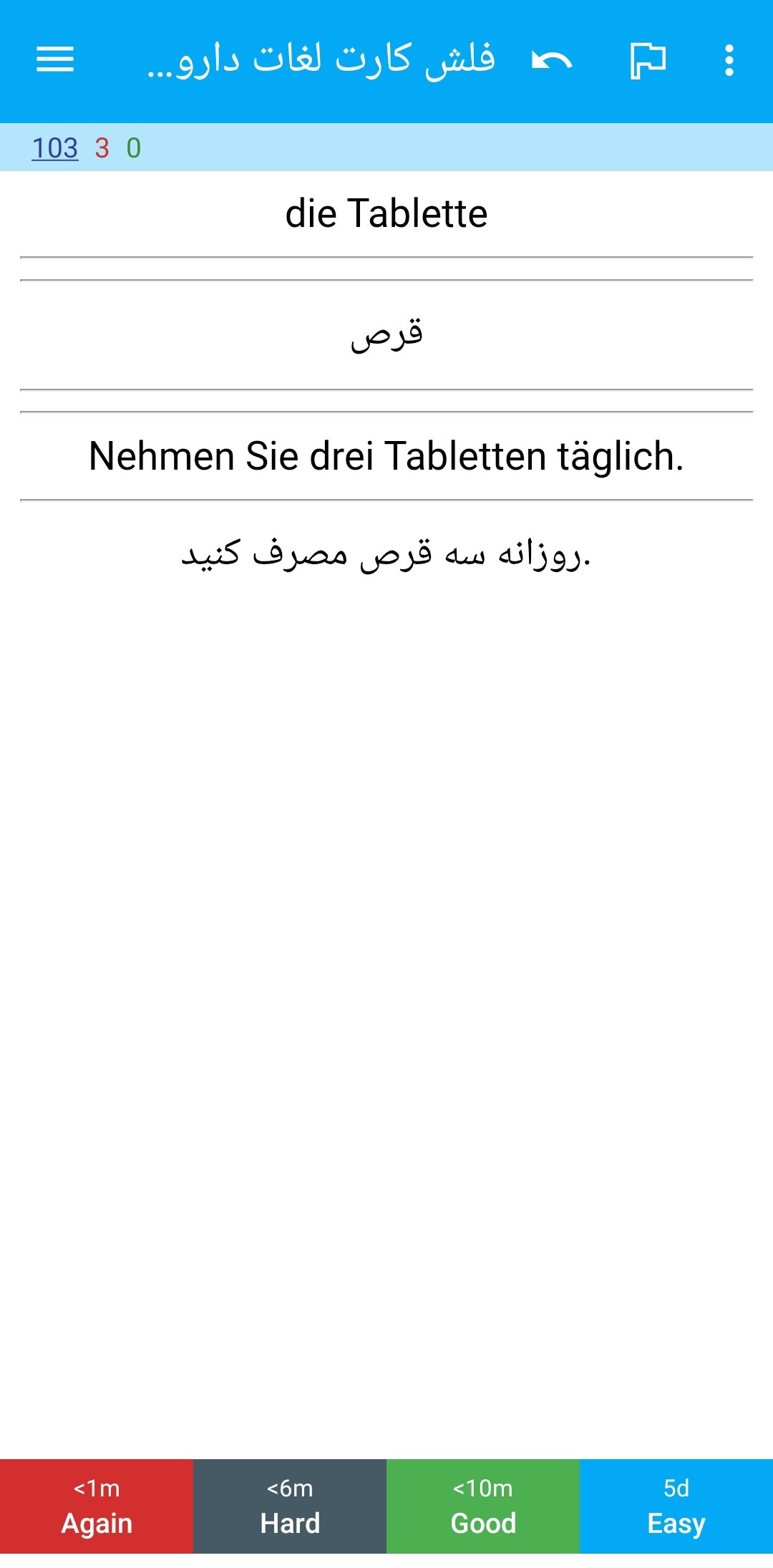 در این فایل فلش کارتی 106 اصطلاح داروخانه به زبان آلمانی به همراه مثال و ترجمه فارسی آنها قرار دارد.
